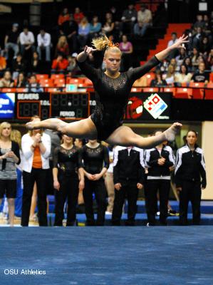 CORVALLIS - Freshman Mandi Rodriguez “stuck” the landing on her first tumbling pass on the floor exercise energizing the crowd and the Beavers rode the momentum provided by the home crowd of 3,086 to a victory over No. 7 UCLA Friday night. The 16th-ranked Beavers were led by Jami Lanz, who used three 9.900’s (bars, beam and floor) to score a career-high 39.550 in the all-around to win the individual title. OSU, which had not beaten the Bruins in the teams’ last 10 meetings going back to 2003, eclipsed the 49- point mark on all four events for the first time this season tallying season-highs on bars (49.100) and floor (49.275) to win the meet with another season-high score, 196.650-196.375. Rodriguez went on to score 9.925 to win the floor exercise and tally the highest score of her career on any event. “When I finished my first pass I heard the crowd go wild and it really motivated me to finish strong,” said Rodriguez. The Beavers trailed at the midway point by .375 when they approached their strongest event, the balance beam. OSU, which had the ninth-ranked beam team in the nation entering the night, put together a solid set. Junior Courtney Dennison recorded a season-high 9.775 to set the tone for the Beavers and was followed by freshman Laura-Ann Chong (9.825), redshirt-freshman Brooke Barclay (9.850) and sophomore Tasha Smith (9.825), who all tallied solid scores. Lanz finished the scoring for the Beavers with her second 9.900 of the evening. Meanwhile, the Bruins did a solid job on the floor exercise, but due to injuries were only able to muster five competitors. Oregon State’s beam performance left the Beavers just one-tenth of a point behind the Bruins heading into the final stanza. Junior Megan Devencenzi scored a 9.775 to lead off the Beavs floor lineup before Rodriguez ignited the crowd. Following Rodriguez performance was sophomore Kera Bolen, who recorded the first 9.900 of her career, and then Lanz, who finished the best meet of her career with yet another 9.900. Smith anchored the floor team and, despite stepping out of bounds on her first tumbling pass, finished the scoring with a 9.775 to wrap up the win. The Beavers begin a stretch of three consecutive road meets next week at Washington where they’ll also face Seattle Pacific at Hec Edmundson Arena at 7:00 PM. OSU’s next home meet is the Salbasgeon Suites Invitational when the Beavers host Utah, Washington and Seattle Pacific. Tickets are on sale now. Other notes from the meet: - OSU’s 196.650 ties the 19th highest score ever recorded by the Beavers. - Jami Lanz’s score of 39.550 ties for the 12th best all-around score ever by an OSU gymnast. - In all OSU gymnasts set or tied seven career-highs: Mandi Rodriguez, V (9.900 tied) Jami Lanz, UB (9.900 tied) Laura-Ann Chong, UB (9.825) Jami Lanz, BB (9.900 tied) Mandi Rodriguez, FX (9.925) Kera Bolen, FX (9.900) Jami Lanz, AA (39.550)