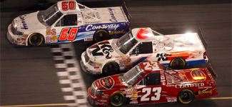 DAYTONA BEACH Fla. - In a three-wide finish reminiscent of the 2003 NASCAR Craftsman Truck Series race at Daytona International Speedway, Jack Sprague's No. 60 Con-way Freight Toyota got a push from Johnny Benson's Toyota to nip Travis Kvapil at the start/finish line on the final lap to capture the Chevy Silverado HD 250. Sprague and Benson split Kvapil right at the finish line, relegating him to a third-place finish, .034 seconds behind winner Sprague. Sprague, who started on the pole and led 16 laps, was grateful for the push by Benson. "This is the most awesome win I've ever been able to accomplish," Sprague said. "I can't thank Johnny Benson enough; he won this race for me. We got a run off (Turn) 4 and he hit me so hard my teeth fell out. It shot me right by (Kvapil) and as a result he was able to shoot by Travis, barely. That was pretty cool that Johnny finished second because if it weren't for him hitting me like he did, I would have never won this race." The victory was not only the first win for Sprague at Daytona, but also the first manufacturer win for Toyota. "I'm sure it's huge for them as well as me," Sprague said about the win. "Selfishly, I think it's really cool. I mean, it will always be in the record book that I was the first one to drive a Toyota and win at Daytona. I knew Toyota would win Daytona. I just never thought Jack Sprague would." Kvapil, driver of the No. 6 Roush Racing Ford, led 49 of the 100 laps and was part of the three-wide truck finish in 2003 race that was won by Rick Crawford. "I've been here before and I knew that was going to happen," Kvapil said. "I'm disappointed. I don't know how I could have done it any better. I guess I could have tried blocking Sprague better, but I thought we would have wrecked." The night saw nine drivers swap the lead 21 times and produced the eighth different winner in eight years of Craftsman Truck Series racing at Daytona.