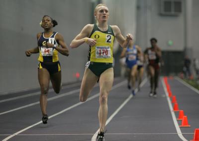 SEATTLE - The University of Oregon track and field teams added two school records, two wins, and seven NCAA qualifying marks Saturday in Mountain Pacific Sports Federation second and final day action hosted by the University of Washington in the Dempsey Indoor Center. In the women’s 800m, returning NCAA outdoor champion and sophomore Rebekah Noble moved to lead just before the bell lap on the 307-meter UW track and raced away from her competition to win by .72 seconds over California All-American Alysia Johnson (second, 2:05.63). The Spokane, Wash., native Noble scored a 3.50-second season best and was just off her indoor personal best (2:04.72) that came on the same track in January 2006. Noble’s mark also eclipsed the NCAA automatic standard (2:05.20) – a time that only six other runners had met in ’07 before this weekend. “I ran pretty fast last night so that gave me some extra confidence coming in,” Noble said. “The race went the way we thought it might, and before it started to slow, I decided to take the lead so we could still be on pace for an automatic qualifying time. I knew I was ready to run fast – workouts had been going great – and I feel stronger and faster than I did at this point last year.” Also in the women’s 800m Saturday, junior Kasey Harwood followed in 14th place (2:14.63) with a .67-second season best. In the meet finale, the 4x400m relay, Noble came back to run a high 53-second split on the second leg as the quartet of junior Kavina Hall, Noble, sophomore Leah Worthen and freshman Keshia Baker finished second in their third school record of the season (3:37.64) behind Arizona State (first, 3:36.34). The Ducks’ previous school record - 3:38.92 – came two weekends ago in the Tyson Invitational in Fayetteville, Ark., and also met the 3:40.00 qualifying standard. Going into this weekend, only 14 teams had run faster than the Ducks did Saturday on the NCAA qualifying list. The night before on Friday evening, Noble also collaborated on the Ducks’ distance medley relay that won with a strong NCAA provisional mark (11:18.29) and included a sub-2:04.00-second 800m split. In other distance action Saturday, freshman Nicole Blood clocked the team’s 3,000m season best in her collegiate event debut (fifth, 9:29.87), and her NCAA provisional time met the 9:34.00 qualifying standard. Other Ducks in the race included sophomore Zoe Nelson (ninth, personal best 9:47.41) and freshman Lauren Zaludek (14th, collegiate debut 10:04.91). In the 400m, redshirt junior Irie Searcy dropped her season best by 1.33 seconds and finished sixth overall (56.17) – five places better than her finish in ’06 – and her time moved her to fifth all-time for UO. In the field events, redshirt senior Lauryn Jordan made her triple jump season debut (sixth, 39-9 3/4). UO’s third-best indoor triple jumper of all-time was only 3/4 inches off her indoor personal best (39-10 1/2) from 2006. Other second-day results included senior Dana Buchanan (mile, ninth, 4:57.67) and freshman Eniko Eros (high jump, eighth-tie, 5-3 3/4). Overall in the team race, Arizona State won the team championship with 135 points ahead of Stanford (second, 96), California (third, 79), Washington (fourth, 74 1/2), Arizona (fifth, 73 1/2), Washington State (sixth, 72), Oregon (seventh, 65 1/2), UCLA (eighth, 40 1/2), Long Beach State (ninth, 15) and UC Irvine (10th, 8). On the men’s side, sophomore Galen Rupp surged away from the field in the 3,000m in the final 1/3 of the race to win by over a second (7:54.19) over Arizona’s Obed Mutanya (second, 7:55.24) and California’s Giliat Ghebray (third, 7:56.51). The Portland, Ore., native’s school record moved him up two spots on UO’s all-time list past former All-Americans Steve Fein (7:54.26, 1999) and Eric Logsdon (second, 7:54.29, 2005), and improved on his personal best from 2006 (7:54.90). Rupp’s NCAA provisional time was just off the NCAA automatic standard (7:54.00), and will likely garner an NCAA return for the four-time All-American and may even put him top-five nationally on the national rankings since only three runners had run faster before this weekend. UO also received 3,000m season bests and NCAA provisional clockings from A.J. Acosta (seventh, 8:02.80) and sophomore Scott Wall (eighth, 8:02.86) who ran 1.91- and 10.93-second personal bests, respectively, and also ducked under the 8:05.00 provisional standard. Not far behind, redshirt sophomore Chris Winter (13th, 8:13.06) was only .36 seconds off his season best. In the mile, junior Michael McGrath ran his second NCAA provisional time of the year and finished second in a .15-second season best (4:02.97), behind Washington’s Austin Abbott (first, 4:02.82). Other Ducks that narrowly missed the NCAA provisional standard (4:04.00) in the race included freshman Andrew Wheating (sixth, 4:05.62) and redshirt sophomore James Withers (seventh, season best 4:05.67). In the 800 meters, junior A.J. Casteel ran a nearly two-second personal best (sixth, 1:51.33), and challenged for a spot on UO’s all-time list, and was just off the fifth position held by former Duck All-American Shannon Lemora (1:51.3, 1992). Duck freshman Ryan Waite also ranked top-10 in the event final Saturday with his .68-second personal best (10th, 1:52.82). In the sprints, freshman sprinter Chad Barlow ran a .30-second personal best in the 400m (second, 47.82), and finished second overall behind Arizona State All-American Domenik Peterson (first, 47.59). Barlow’s time moved him closer to UO’s fifth-best 400m mark of all-time, held by Travis Anderson (47.50, 2004). UO’s other entry in the event, junior Marcus Dillon ran the fastest time of the day, but was disqualified for a lane violation at the cut-in zone. Junior Phil Alexander, Barlow, Dillon and Eaton came back in the meet’s finale, the 4x400m relay, with a .01-second season best and their second NCAA provisional mark and sub-3:10.00 time of the season (seco