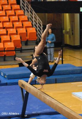 Gainesville, Fla. - Oregon State opened the 2007 season with a solid all-around performance and sophomore Jami Lanz was her usual steady self, finishing second in the all-around against No. 3 Florida Friday night. The Beavers got off to a shaky start before steadying out and fighting to its solid season-opening score against the Gators losing 193.800-196.850. Despite a pair of falls on the uneven bars during the first rotation, the Beavers’ score of 193.800 took OSU until week three to achieve in 2006. “I’m excited about the promise this team showed tonight,” said head coach Tanya Chaplin. “They didn’t get down and kept working and fighting throughout the meet. We have a lot to improve on but I am happy with what this team did on its first time out there. We traveled a long way and this effort made it worth the trip.” Lanz, despite having been sick most of the week, conducted business as usual scoring 9.825 on vault and floor and 9.750 on bars and 9.725 on beam to total a 39.125 in the all-around. Oregon State freshmen Mandi Rodriguez and Laura-Ann Chong each performed in the all-around, scoring 38.450 and 38.350 respectively. Rodriguez tied for second on vault with a 9.850. Notes: Sophomore Tasha Smith did not travel to Gainesville after suffering a knee injury during Tuesday’s practice. Smith is considered week-to-week. Redshirt freshman Brooke Barclay recorded the first score of her career after tearing the ACL in her right knee in last year’s season opener during her first routine. Barclay scored 9.775 on vault and 9.625 on the beam. Team Scores: No. 3 Florida 196.850; No. 12 Oregon State 193.800. All-Around: 1. Ashley Reed (UF) 39.375; 2. Jami Lanz (OSU) 39.125; 3. Amanda Castillo (UF) 39.075. Other OSU Scores: Mandi Rodriguez 38.450; Laura-Ann Chong 38.350. Vault: 1. Ashley Reed (UF) 9.900; T2. Mandi Rodriguez (OSU), Breanne King (UF) 9.850. Other OSU Scores: Jami Lanz 9.825; Brooke Barclay 9.775; Yuki Lamb 9.775; Laura-Ann Chong 9.650; Megan Devencenzi 9.650 (Exhibition – Whitney Watson ). Bars: 1. Melanie Sinclair (UF) 9.925; 2. Corey Hartung (UF) 9.875; 3. Ashley Reed (UF) 9.80. OSU Scores: Laura-Ann Chong 9.775; Jami Lanz 9.750; Keegan Fitzgerald 9.750; Mandi Rodriguez 9.500; D'Anna Piro 9.075; Kera Bolen 8.900 (Exhibition – Whitney Watson ). Beam: 1. Ashley Reed (UF) 9.875; T2. Breanne King (UF), Melanie Sinclair (UF), Corey Hartung (UF) 9.850. OSU Scores: Claire Pierce 9.825; Jami Lanz 9.725; Courtney Dennison 9.675; Laura-Ann Chong 9.675; Brooke Barclay 9.625; Mandi Rodriguez 9.425. Floor: 1. Corey Hartung (UF) 9.925; 2. Savannah Evans (UF) 9.900; T3. Katie Rue (UF), Amanda Castillo (UF) 9.875. OSU Scores: Jami Lanz 9.825; Kera Bolen 9.800; Claire Pierce 9.700; Mandi Rodriguez 9.675; Yuki Lamb 9.550; Laura-Ann Chong 9.250
