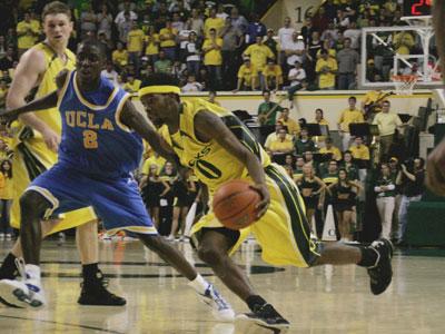 EUGENE - Ducks guard Aaron Brooks scored 25 points, including the game-winning base-line jumper with :13 seconds left, as #16 Oregon handed #1 UCLA its first loss of the season, 68-66 on Saturday at McArthur Court. Maarty Leunen added 18 points, and seven rebounds, while Bryce Taylor chipped in 11 points for the Ducks (14-1 overall, 2-1 Pac-10) UCLA was led by Josh Shipp who had 16 points and five rebounds. Arron Afflalo added 14 points, and Darren Collison had 11 points and four assists for the Bruins (14-1 overall, 3-1 Pac-10). Oregon shot 47.8 percent from the field compared to UCLA who shot 41.8 percent. UCLA shot 34.8 percent (8-23) from behind the arc, compared to the Ducks 33.3 percent (5-15) Attendance was 9,087. Oregon-UCLA postgame quotes: Oregon: Head Coach Ernie Kent On taking fewer three point shots: "We knew that we were a great team off the dribble. We showed that in the Georgetown game. I thought the way we read the floor and took the ball to the basket was a lot like the Georgetown game." "Our team has really been through a lot, and to their credit they have battled through it. I appreciate them for sticking with us, and sticking with themselves." "Their is still a lot of growth potential for this team. The key is to get healthy." On G Malik Hairston sitting out: "I thought this game was going to be too intensity filled to bring him back, because he's a competitor and he would have wanted to go out their and battle." "We are a small team, and we want to spread the floor and use our speed. We always want to keep the pressure on teams, all the way through the last possession." Junior F Maarty Leunen "That was probably the biggest game in my three years here. We had a lot to prove, and this was a huge win, for us to beat the number one team in the nation." "This was a physical game. Even their guards play really physical. We just had to step it up and compete with their players." On guarding F Josh Shipp on the last shot: "I just had to play good, solid defense. I knew he had to put up a quick shot because the clock was running out, and luckily it didn't go in." "We were disappointed with how many three's we attempted against USC, and we made it a priority to take the ball to the hoop and make them play defense." Junior F Bryce Taylor "This proves all the doubter wrong that didn't think we were a high caliber team. We knew we had the athletes to compete with (UCLA) position-to-position, and today we did." On the play of G Aaron Brooks "Aaron is clutch, we look for him to take over at the end of the game. I've never played with anyone like him. He's incredible." Senior G Aaron Brooks On making the go ahead shot at the end of the game: "I was dribbling down the baseline, and I heard (Darren) Collison call for a trap, so I wanted to shoot before they got to me. I wanted to run some more time off the clock, but I was open so I just took it." "We knew UCLA was going to work hard for 40 minutes, and we would have to match them. We were able to outlast them today." "Thanks to the coaches, we play in a system where we can compete with anybody. We just wanted to come out and show what we can do." UCLA Junior G Arron Afflalo "I never thought I would feel this way my entire career here. I actually thought this team couldn't be beaten." On the last play of the game: "We should have never been in that situation in the first place and I take the blame for that. My game in the first half was disgusting." "I don't want to feel this way ever again so I'm going to have to do what I've got to do." "I don't think we came out with the intensity we needed. They penetrated well." On the crowd: "They kept them in the game early. Toward the end we really kind of tuned the crowd out." Freshman G Russell Westbrook "I think we'll bounce back well. We're a good team and we've fought through things before." "I always have faith that in the end we're going to pull it out. Unfortunately, we didn't." "This was my first really hostile environment so it was a factor." Sophomore G Darren Collison On the last play of the game: "I think we settled for a three-pointer when we should have went for two. I tried to drive and we didn't have anything there." "That's a good team. They've got a lot of great guards that can just beat you off the dribble. They weren't settling for shots. They were going to the basket." Up next for the Ducks is a road game Thursday against Arizona State. Tip-off is set for 7:30 PM.