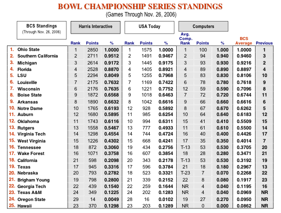 POLL EXPLANATION & ABOUT THE BCS: To derive a team’s poll percentages in the Harris Interactive and USA Today polls, each team’s point total is divided by a maximum 2850 possible points in the Harris Interactive Poll and 1575 possible points in the USA Today Poll. Teams are assigned an inverse point total (25 for #1, 24 for #2, etc.) for each of their respective computer poll rankings to determine the overall computer component. The highest and lowest ranking for each team is dropped, and the sum total of the remaining four rankings is divided by 100 (the maximum possible points). This figure produces a Computer Rankings Percentage.