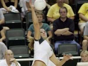 EUGENE - The University of Oregon volleyball team withstood its toughest challenge of the season Saturday night before securing a five-set win over San Diego State at McArthur Court. The Ducks (7-0) remained unbeaten by nipping the Aztecs (4-5), 30-24, 25-30, 30-22, 20-30 and 15-6. “We came out really focused and rallied together as a team,” freshman middle blocker Sonja Newcombe said of the Ducks’ fifth-game performance. “We got into a good rhythm.” Newcombe had six of her 20 kills in the deciding frame, accounting for six of the 15 points needed for victory. The Ducks appeared to come out right where they left off on Friday night, when they swept Fresno State in three games. But Oregon lost some cohesion from Game 2 through Game 4 and San Diego State capitalized. The Aztecs, led by Kelley Wahlin’s 10 blocks, stuffed the Ducks at the net 17 times while Oregon managed only six total team blocks over five games.